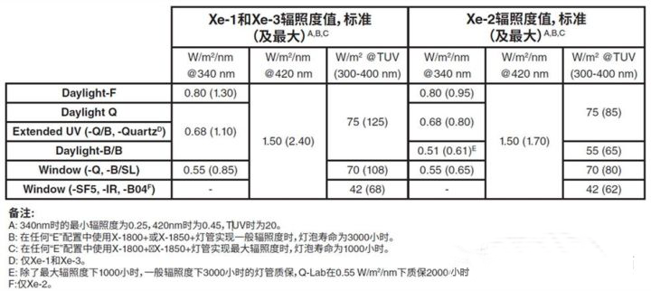 有太陽(yáng)眼輻照度控制系統(tǒng)的設(shè)備可以設(shè)定輻照度水平。例如, 對(duì)于 UVA-340燈管, 設(shè)定0.89W/m2@340nm的輻照度和夏天正午時(shí)光強(qiáng)相當(dāng)。為了更快地得到測(cè)試結(jié)果,紫外老化箱QUV可被設(shè)置在夏天正午光強(qiáng)200%條件下運(yùn)行?;诓煌瑹艄茴?lèi)型下表列出最高輻照度水平及一些常用的輻照度設(shè)置點(diǎn)。